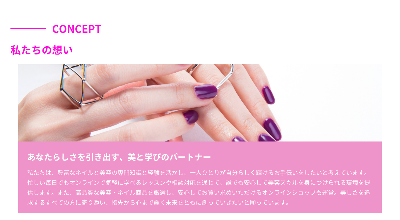 ネイル施術やビューティーケア、オンラインレッスンやカウンセリングを行います。